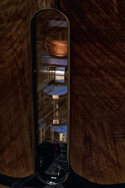 Ostatnim wynalazkiem ukrytym w obudowie jest komora średniotonowego, nazwana Intono, opisana przez producenta też w skrócie jako układ rezonansowy z dostrojonymi wgłębieniami, oddziaływający na charakterystykę tak, aby można było uprościć filtr elektryczny zwrotnicy. Zwrotnica nie wygląda jednak na uproszczoną…