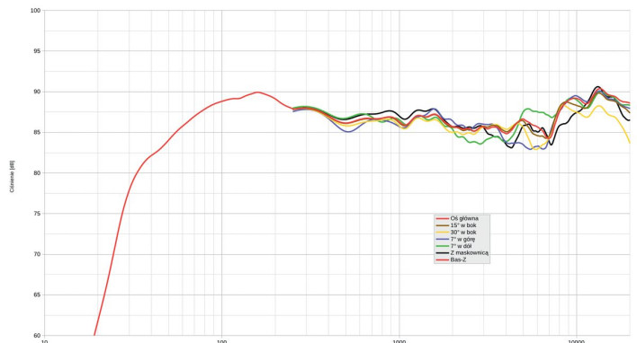 Charakterystyki zmierzone pod różnymi kątami w płaszczyźnie pionowej rozchodzą się trochę w szerokim zakresie 2–7 kHz, co wynika głównie ze zmieniających się relacji fazowych między średniotonowym a wysokotonowym, a to wskazuje na zastosowanie łagodnego fi ltrowania, zwłaszcza średniotonowego.
