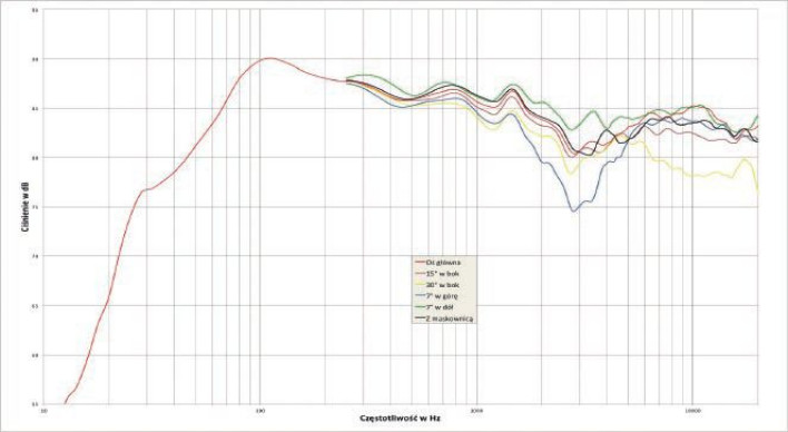 To układ symetryczny (dwa nisko-średniotonowe z wysokotonowym pomiędzy nimi), który najlepszą współpracę fazową organizuje na osi wysokotonowego (gdyż tam odległość od obydwu nisko-średniotonowych jest taka sama). Tak wyznaczona "konstrukcyjna" oś główna leży jednak znacznie niżej, i w naszym pomiarze pokrywa się mniej więcej z osią -7O (oś główna naszego pomiary nie jest osią symetrii układu głośnikowego), dlatego najlepszy przebieg - praktycznie bez wspomnianego osłabienia - uzyskaliśmy właśnie pod kątem -7O, podczas gdy na osi +7O osłabienie jest największe (w stosunku do osi symetrii układu kąt jest znacznie większy). Można z tym sobie poradzić łatwiej niż w sytuacji odwrotnej (gdy lepsza charakterystyka jest na kątach dodatnich) - wystarczy kolumny lekko pochylić do tyłu (a ryzykowne jest pochylanie ich do przodu).
