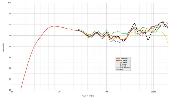 Biorąc pod uwagę najlepszą (teoretycznie) charakterystykę z osi -7º, możemy ją zmieścić w ścieżce +/-3 dB, w zakresie od ok. 40 Hz (producent podaje 38 Hz) do… nie wiemy, bo nasz pomiar kończy się przy 20 kHz. Na skraju pasma charakterystyka zaczyna już opadać, ale na tej podstawie nie mamy prawa wykluczyć, że ”jakimś sposobem” dociąga do podawanych przez producenta 34 kHz.