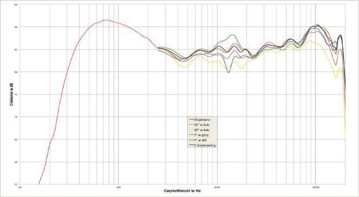 Jak na tubę, charakterystyka jest w szerokim zakresie wręcz wygładzona (częstotliwość podziału to 1,5 kHz), a nawet na samym skraju pasma, blisko 20 kHz, mamy bardzo dobre rozpraszanie. Z samych pomiarów trudno byłoby odgadnąć, że to rezultaty osiągnięte przez tak dużą tubę wysokotonową.