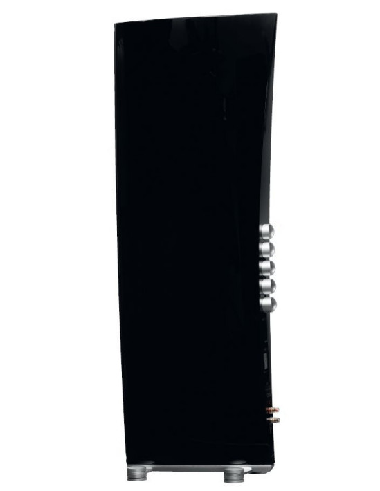 Dodaje to wizualnej dynamiki całej bryle, a przy tym idzie w parze z… funkcjonalnością tylnego panelu; wymagający nieco większej szerokości terminal przyłączeniowy jest przecież na dole, a w połowie wysokości, gdzie panel jest względnie najszerszy, zmieścił się zestaw tuneli bas-refleks.