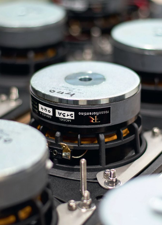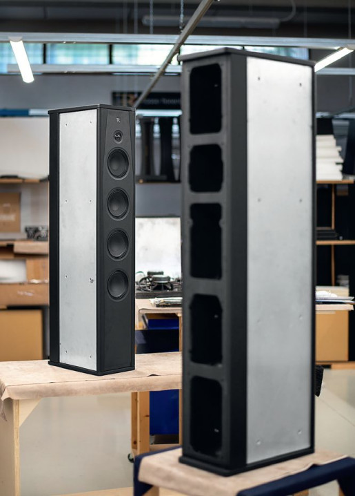 Produkcja i montaż samych obudów odbywa się we włoskiej fabryce. Kolumny na zdjęciu nie mają jeszcze przymocowanych paneli bocznych ani przykręconej tylnej ścianki, chociaż widać już głośniki, a z wnętrza "przebłyskują" zwrotnice.