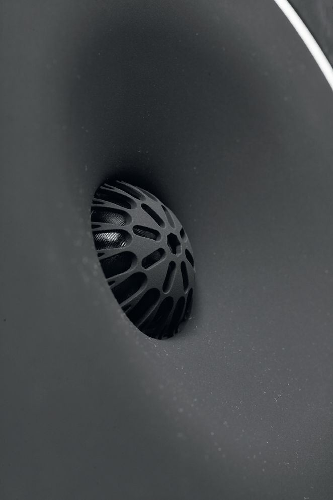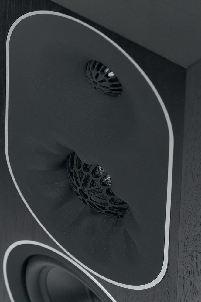 Producent zapewnia nie tylko o tym, że falowód ten rozszerza charakterystykę kierunkową, ale też lepiej integruje głośnik średniotonowy z wysokotonowym (który również ma falowód, ale już typowy, gładki). Kopułka wysokotonowa, podobnie jak średniotonowa, jest tekstylna.