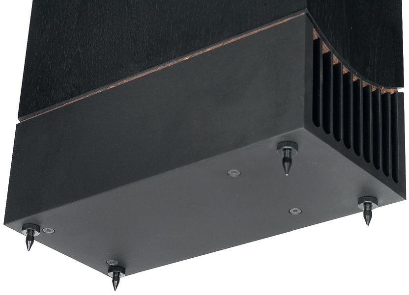 Przeszukałem pudło, znalazłem tylko kolce wkręcane bezpośrednio w gwinty, obsadzone w dolnej powierzchni obudowy. Cokołu w żadnej formie nie ma, co może wydawać się trochę ryzykowne, ale było możliwe dzięki dociążeniu dolnej części konstrukcji.