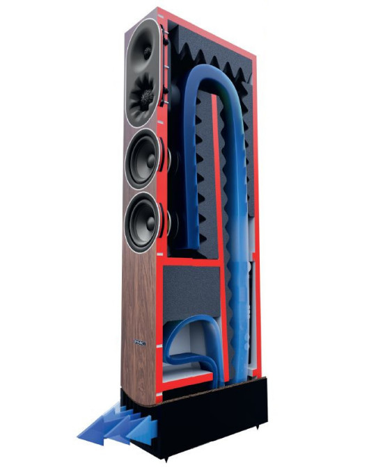 Opublikowany przekrój wskazuje na coś specjalnego: bezpośrednio nad wylotem znajduje się komora, do której prowadzi wąskie wejście; wygląda to na "antyrezonator", pułapkę basową, dostrojoną do częstotliwości, której wypromieniowanie mogłoby negatywnie wpłynąć na charakterystykę.