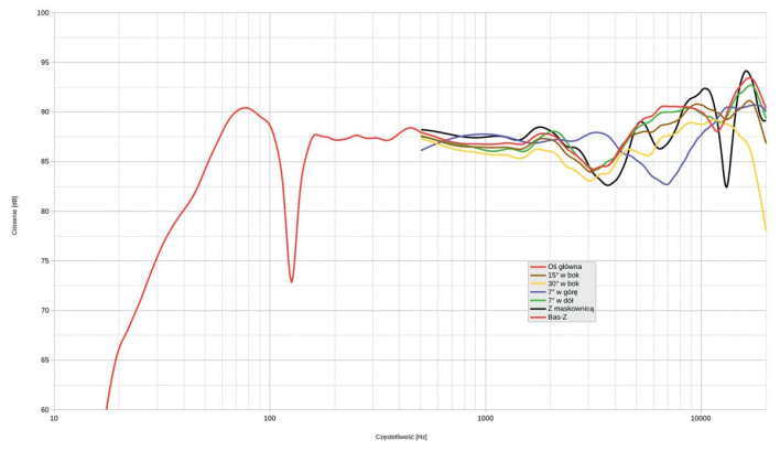 Charakterystyka jest w zakresie średnio-wysokotonowym pofalowana, a układ osłabień i wzmocnień zmienia się przy zmianie osi w płaszczyźnie pionowej.