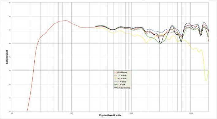 W tym samym miejscu swój "udział w pracach" zaznacza niepotrzebnie maskownica, wywołując dołek przy 3 kHz, a także pogłębiając kolejny przy 7 kHz - lepiej odłożyć ją na bok. Dość nietypowo, na osi 30O pojawia się osłabienie już w zakresie średnich częstotliwości, z kolei na osi 15O nie widać już żadnych dodatkowych problemów. Kolumny lepiej wycelować w miejsce odsłuchowe, ale nie musimy tego robić z zegarmistrzowską precyzją.