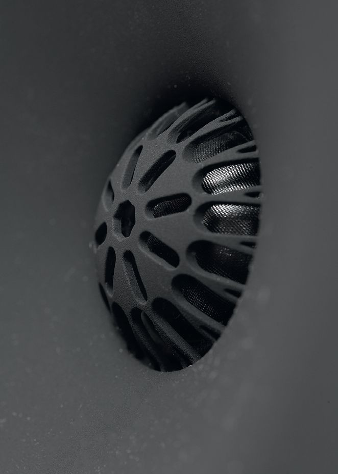 Tekstylna kopułka wysokotonowa została wyposażona w falowód (wyprofilowanie dookoła), który ma wpływ głównie na niższy podzakres jej pracy, i oryginalną siateczkę – soczewkę akustyczną profilującą najwyższe częstotliwości.