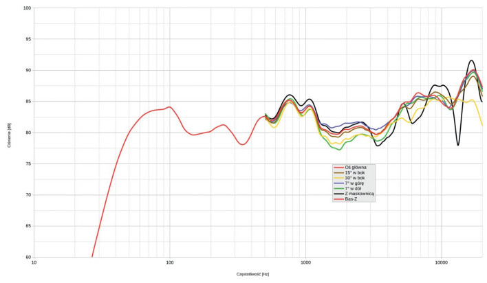 Osłabienie w zakresie 1,5– 4 kHz, związane z częstotliwością podziału, zmienia się w płaszczyźnie pionowej; najmniejsze jest pod kątem +7º, a więc dla słuchacza siedzącego teoretycznie wysoko, co jednak nie będzie takie trudne, gdyż oś główną pomiaru ustaliliśmy dość nisko, na wysokości 80 cm, zgodnie z klasycznymi regułami wyprowadzając ją pomiędzy głośnikami nisko-średniotonowym a wysokotonowym. Maskownica, mimo że cienka i wyprofi lowana, wprowadza dodatkowe zaburzenia w dość szerokim zakresie częstotliwości, więc lepiej ją zdjąć.