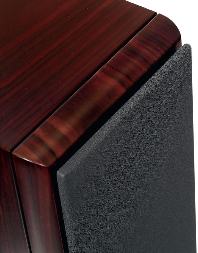 Sposób wykonania obudowy Mozarta nie zmienił się od wersji Grand, nadal cieszy oko naturalnym fornirem, zaokrągleniami i wyeksponowaną grubością ścianek przedniej i tylnej (przed dylatacją jest 25 mm, chowa się jeszcze 5 mm). Cienka maskownica jest trzymana przez magnesy.