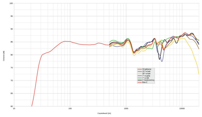 Warto dodać, że gdyby nie bardzo wysokie (6-cm) kolce, siedząc na określonej wysokości, bylibyśmy bliżej charakterystyki z osi +7º (tej słabszej). Również maskownica powoduje osłabienie przy ok. 4 kHz, ale chociaż widać je wyraźnie, to nie straszyłbym, że będzie podobnie słyszalne – jest wybitnie wąskopasmowe.