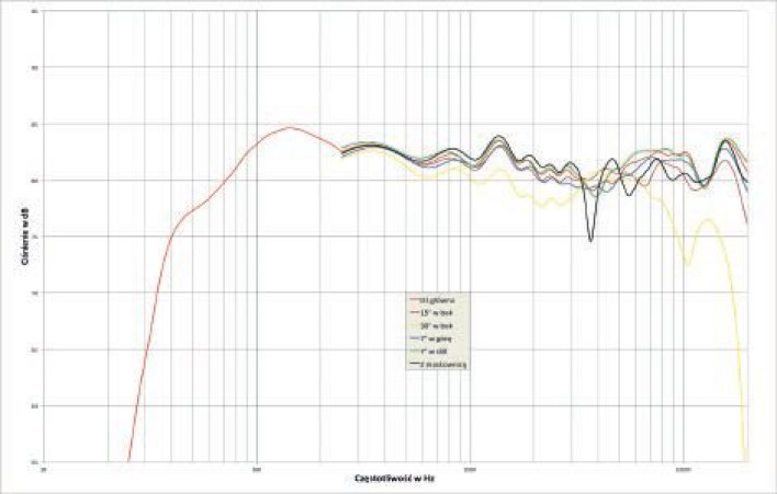 Z kolei charakterystyka przetwarzania zasługuje na uznanie, o ile tylko liniowość uznajemy za cnotę. Z Diamondów 10.1 nie otrzymamy wyeksponowanych wysokich tonów ani uprzejmie osłabionego "wyższego środka", bas też się nie odznaczy wysokim poziomem, za to osiągnie niską częstotliwość graniczną - spadek -6 dB pojawia się przy 45 Hz. Nie musimy też pilnować dokładnie wyznaczonej osi, na jakiej powinniśmy się znaleźć - charakterystyka nie zmienia się istotnie wraz ze zmianą kąta w płaszczyźnie pionowej ani pod kątem 15O w płaszczyźnie poziomej, dopiero pod kątem 30O widać spadek wysokich tonów. Maskownica wprowadza zauważalne, ale w sumie niewielkie zmiany.