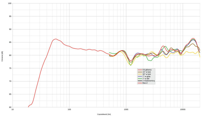 Na wyposażeniu nie ma maskownicy, stąd nie ma też związanej z nią charakterystyki. Ważniejsza jest ogólniejsza tendencja w kształcie charakterystyk – wzmocnienie skrajów pasma, szczyty przy 55 Hz i 15 kHz są ich najwyższymi punktami.