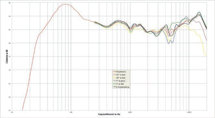 Przechodząc powyżej basowej "górki" z okolic 100 Hz, charakterystykę z zakresu 150 Hz - 20 kHz możemy zmieścić w ścieżce +/-3 dB, w zakresie drugiej częstotliwości podziału widząc tylko delikatne rozejście się krzywych zmierzonych na różnych osiach; pod kątem +7O pojawia się lekkie osłabienie przy 5 kHz, poza tym jest spokojnie. Maskownica również nie wprowadza bałaganu.