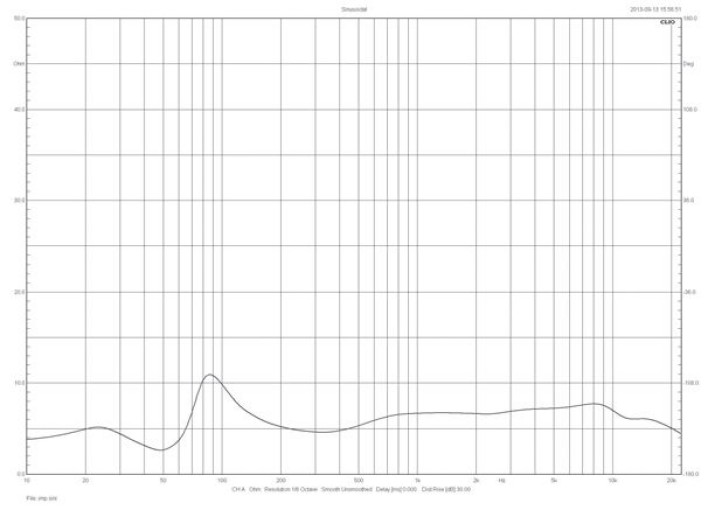 Wyjątkowo możemy zgodzić się z sytuacją, gdy impedancja znamionowa określona jest na 6 omów, a minimalna wartość wynosi 3 Ω (o czym informuje producent w swoich danych), ponieważ minimum to pojawia się przy 50 Hz, a impedancję znamionową, zgodnie z normą, powinno ustalać się na podstawie minimum leżącego powyżej szczytu rezonansu, ten znajduje się przy 85 Hz.