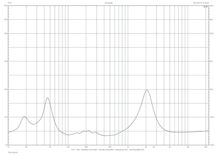 Konstruktorzy zwrócą uwagę na pewne detale charakterystyki impedancji - drobne pofalowanie w okolicach 200 Hz, będące znakiem jakichś pasożytniczych rezonansów, a także podniesiony znacznie ponad wartość minimalną poziom "w dołku" pomiędzy wierzchołkami bas-refl eksowymi (przy ok. 28 Hz), wskazującym na częstotliwość rezonansową obudowy.