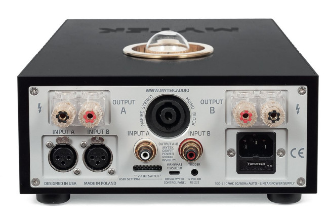 Z centrum frontu wyłania się podświetlane (od wewnątrz) logo Mytek, któremu towarzyszy firmowe oznaczenie na górnej płycie. Z tyłu intryguje lampa w ozdobnym, złotym pierścieniu. Nie przypomina ona żadnego ze znanych elementów… Co to jest, a przede wszystkim jaką pełni rolę? Wyłącznie dekoracyjną, "ocieplając" techniczny wizerunek wzmacniacza w klasie D. Zarówno jej podświetlenie, jak i logo na froncie można wyłączyć.