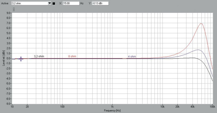 Przy 4 Ω podbicie nadal występuje, ale jest już znacznie słabsze, ok. +2 dB (oczywiście wciąż pozostaje przy wysokich 60 kHz). Uzupełniliśmy więc pomiary o impedancję, która całkowicie eliminuje podbicie i zapewnia najlepszą liniowość – to 3,2 Ω; prawdopodobnie konstruktor optymalizował układ przy 3 Ω, aby zapewnić, że przy niemal żadnej impedancji nie nastąpi spadek, natomiast podbicie… teoretycznie leży poza zasięgiem naszego słuchu, a nawet jeżeli wpłynie na brzmienie w pasmie akustycznym, to w niewielkim stopniu, co potwierdzają odsłuchy. Liniowość w pasmie akustycznym jest idealna.