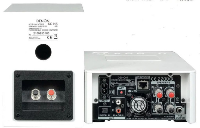 Denon ma tylko jedną parę zacisków głośnikowych, ale dodatkowo niskopoziomowe wyjście dla subwoofera. To rozsądny dodatek, skoro systemowe głośniki są niewielkie. Jest również analogowe wejście liniowe i cyfrowe gniazdo optyczne. Jako system sieciowy Denon ma złącze LAN, moduł łączności bezprzewodowej Wi-Fi został zainstalowany wewnątrz.