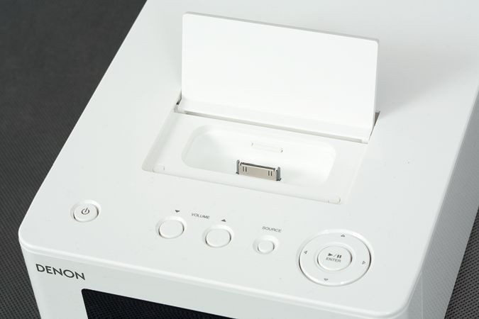 Gdy popatrzymy na górę, dostrzeżemy także klapkę zakrywającą stację do zadokowania urządzeń Apple; Denon posłużył się jednak mechanizmem starszego typu z wielopinowym złączem, co oznacza, że nie zadokujemy np. najnowszego iPhone’a (chyba że sięgniemy po przejściówki).