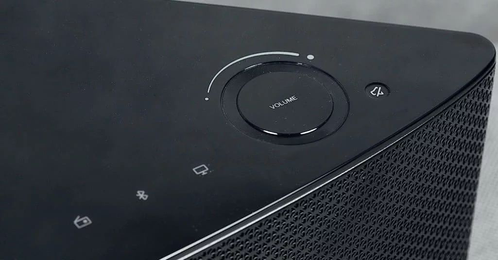 Na górnej/bocznej ściance każdego głośnika mamy pole aktywujące NFC, dotykowe ikony wyboru źródła: radio internetowe (pamięta dowolne trzy stacje - uruchamiane bez pilota), Bluetooth, telewizja, dotykowe pokrętło głośności (precyzyjne) i wyciszanie (nie zatrzymuje ono strumienia, a tylko go wycisza).