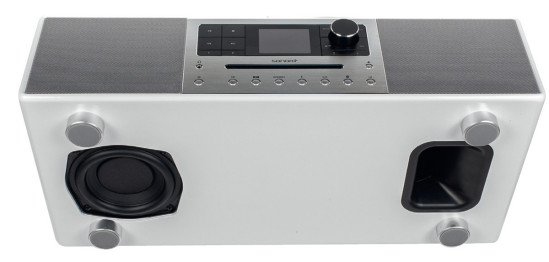 Po dwóch stronach frontu mamy subtelne, metalowe maskownice, chroniące zintegrowany system głośników. W centrum ulokowano duży panel sterowania podzielony na dwie sekcje. Dolna jest bardziej konwencjonalna, przyciskami wybieramy główne funkcje, a mechanizm szczelinowy przyjmuje i w tradycyjny sposób odtwarza płyty CD.