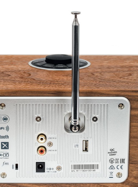 W tylną ściankę wbudowano srebrny panel z elektroniką i gniazdami. Jest wejście niskopoziomowe RCA, cyfrowe USB (odtworzy muzykę z nośników pamięci), a także złącze anteny radia naziemnego (obowiązkowe, bo nie ma anteny wewnętrznej).