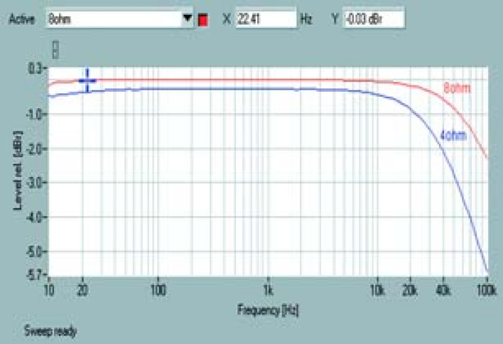 Współczynnik tłumienia nie jest najwyższy, wynosi 27. Na pasmie przenoszenia (Rys.1) widać, że krzywa 4Ω leży o kilka dziesiątych dB niżej od 8Ω. W zakresie basu wzmacniacz radzi sobie bez zarzutu, schodząc niemalże liniowo aż do 10Hz. Granicę 100kHz osiągniemy natomiast dla 8Ω przy - 2,5dB, 4Ω jest wyraźnie słabsze, gdyż przy -3dB pasmo sięga już tylko do 53kHz.
