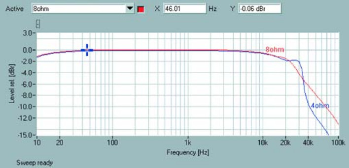 Pod względem pasma przenoszenia (rys.1) AMP3300 nie bryluje, być może to na skutek rezygnacji ze sprzężenia zwrotnego. Na 8Ω przy 10Hz poziom wynosi -1dB, podobnie jest po podłączeniu obciążenia 4Ω. Dobra liniowość utrzymuje się do 7kHz, powyżej których mamy już osłabienie napięcia. Charakterystyka 8ohmzdecydowanie opada w dół, a punkt -3dB osiąga już dla 26kHz. Wykres 4ohm jest nietypowy, spadek rozpoczynający się od 7kHz pokrywa się z wersją 8Ω, lecz przy 4Ω w zakresie 20kHz-30kHz poziom -2dB stabilizuje się, by powyżej 30kHz gwałtownie opadać. Granicę -3dB mamy w związku z tym przy -33kHz.