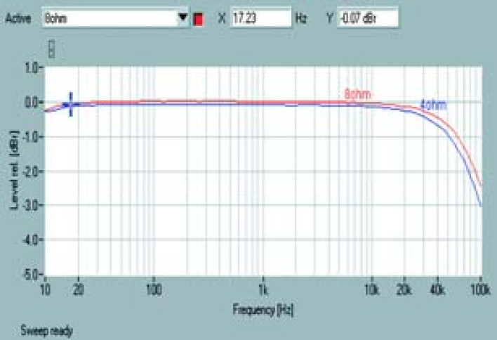 Pasmo przenoszenia (Rys. 1) to solidna praca bez względu na obciążenie, obydwie krzywe niemal się pokrywają, niewielkie różnice występują tylko przy częstotliwościach powyżej 20kHz. Przy 10Hz poziom wynosi -0,2dB i jest identyczny dla 8Ω i 4Ω, przy granicznych 100kHz wzmacniacz oferuje -2,5dB oraz -3dB odpowiednio dla 8Ω i 4Ω.