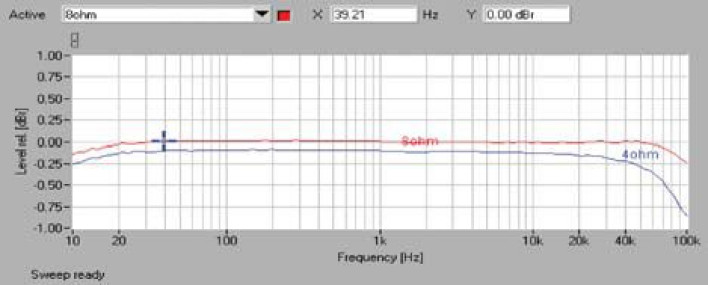 Pasmo przenoszenia (rys. 1) jest świetnie rozciągnięte i liniowe, spadki przy skrajnych częstotliwościach 10 Hz oraz 100 kHz nie przekraczają -0,25 dB dla obciążenia 8-omowego, przy 4 omach są mniejsze niż -1 dB. XA6950V prezentuje ciekawe, jak na konstrukcję tranzystorową, spektrum zniekształceń (rys. 2) -z silną drugą harmoniczną (-67 dB); kolejne parzyste, tj. czwarta oraz szósta są widoczne już znacznie niżej, w okolicach -90 dB.
