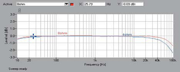 E-250 nie jest rekordzistą w tłumieniu szumów, ale wynik 86 dB można uznać za zadowalający. Pasmo przenoszenia (rys.1) nie daje powodów do narzekania, charakterystyki 8- i 4-omowe są idealnie zbieżne w zakresie niskotonowym (świetne -0,3 dB dla 10 Hz), 100 kHz osiągane jest przy -1,3 dB dla 8 omów i -2,3 dB dla 4 omów. E-250 może pochwalić się niskimi zniekształceniami (rys. 2), jedynie druga harmoniczna o umiarkowanym poziomie -84 dB przebija się ponad granicę -90 dB.