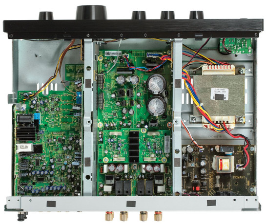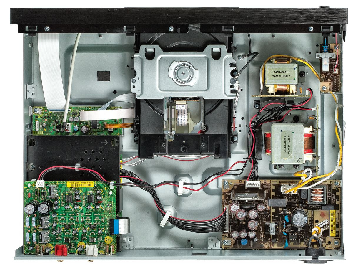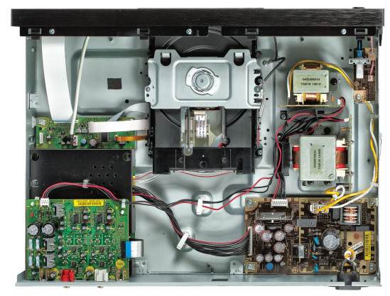 Obudowa odtwarzacza jest bardzo duża i wypełniona. Większy transformator służy prawie wszystkim układom - za wyjątkiem wyjściowych obwodów analogowych, które mają mniejszy, ale własny.