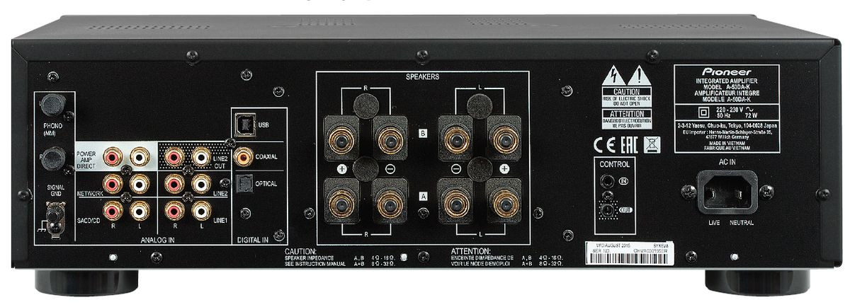 Pioneer A-50DA ma cztery wejścia liniowe i wejście gramofonowe (z korekcją dla wkładki MM). Wejścia cyfrowe są dwa - koaksjalne i światłowodowe. Jest też jedno wyjście analogowe, na którym pojawia się sygnał z wybranego wejścia (również cyfrowego, oczywiście po konwersji C/A). Zaciski głośnikowe są w podwójnym komplecie.