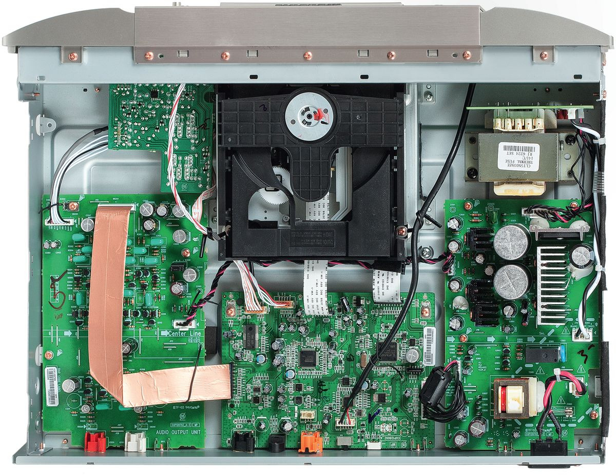 Z tyłu jest jeszcze para gniazd firmowego systemu komunikacji. Dosłownie i w przenośni, u podstaw konstrukcji leży gruba, złożona z kilku warstw dolna płyta (z nowym typem nóżek). Elektronikę podzielono na trzy główne moduły: zasilacza (niewielki transformator rdzeniowy), sekcji cyfrowej (tuż za napędem) oraz wyjść analogowych (za stosownymi gniazdami).