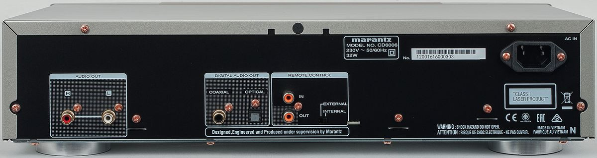 Napęd odczytuje tylko płyty CD (w tym wypalone płytki CD-R/RW, ale czy ktoś dzisiaj jeszcze “pali"?), CD6006 dekoduje również pliki WAV, MP3, AAC i WMA, np. z urządzeń USB. Zestaw wyjść jest klasyczny, oprócz analogowego wyjścia (para pozłacanych RCA) ze stałym poziomem sygnału, są dwa wyjścia cyfrowe (współosiowe oraz optyczne).