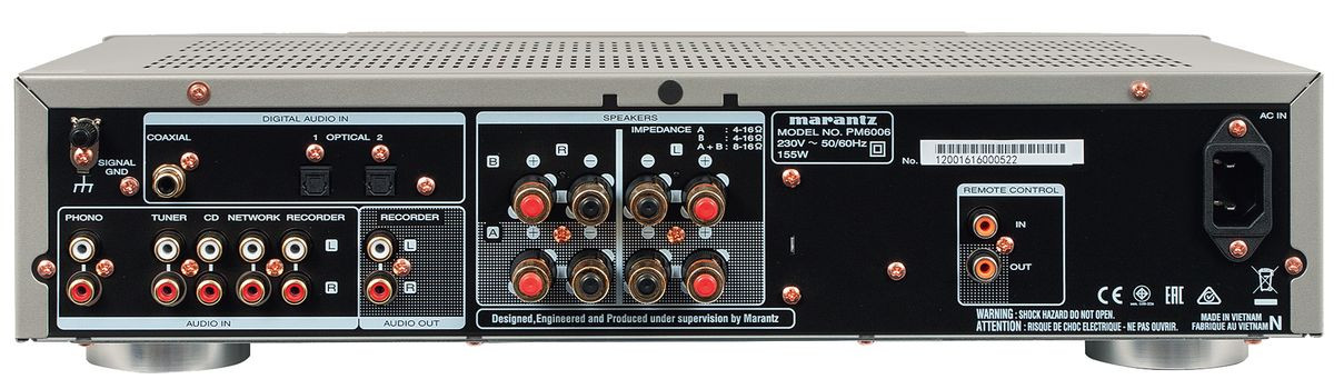 Tylna ścianka jest porządnie wyposażona, wzmacniacz ma cztery wejścia liniowe i jedno wyjście (nieregulowane), jest też wejście gramofonowe (dla wkładek MM); w poprzednim modelu PM6005 była już sekcja cyfrowa, w nowym PM6006 wygląda to podobnie, ale nie identycznie - do jednego gniazda współosiowego i jednego optycznego dołożono drugie optyczne; wszystkie przyjmują (teoretycznie) sygnały PCM o rozdzielczości 24 bit/192 kHz; gdyby jeszcze było USB, szczęście byłoby pełne. Typowo dla Marantza, wyjścia głównej pary A ulokowano na dole, a pary B -na górze, dostęp do nich jest łatwiejszy i tam odruchowo podłączamy przewody.