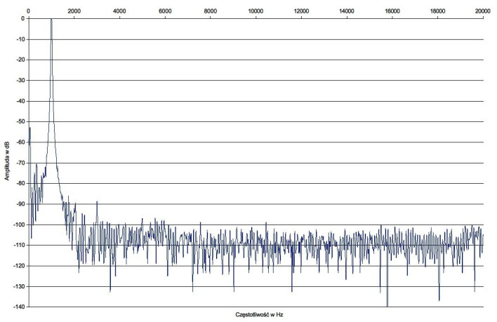 Spektrum zniekształceń (rys. 2) jest czyste, najsilniejsze harmoniczne - druga i trzecia - leżą na granicy -90 dB.