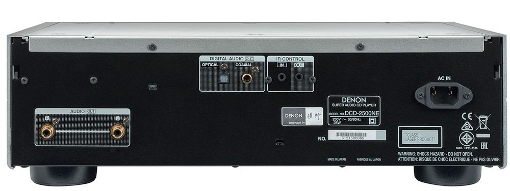 Denon DCD-2500NE ma pojedyncze wyjście RCA (złocone gniazda), typową parę wyjść cyfrowych (optyczne i współosiowe) oraz wejście i wyjście dla sygnałów sterujących.