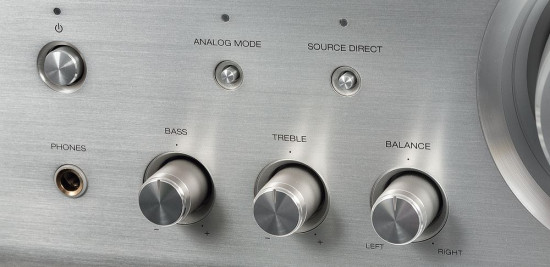 Oprócz wysokiej przedniej ścianki, utrzymanej w stylu serii 2500, na facjacie wzmacniacza ulokowano ogromne pokrętło zatopione w efektownym wyfrezowaniu grubego panelu. Pokrętło kręci się klasycznie, czyli "analogowo", natrafiając z dwóch stron na punkty oporowe. Denon od razu zaznacza bogate wyposażenie wzmacniacza, co widać po trzech wyeksponowanych regulacjach: barwy (tony niskie i wysokie) i zrównoważenia kanałów. Cały powiązany z nimi układ możemy jednak odłączyć systemem Source Direct.