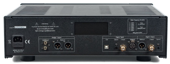 Bogatą paletę gniazd rozmieszczono wygodnie. W ramach wyjść analogowych dostępne są RCA i XLR (obydwa z nieregulowanym poziomem). Efektownie prezentuje się sekcja wyjść cyfrowych, gdzie zadbano o wszystkie popularne standardy, są więc nie tylko złącza elektryczne (współosiowe) i optyczne, ale również AES/EBU.