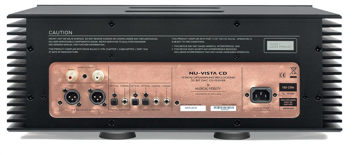 Musical Fidelity Nu-Vista CD Player odtwarza wyłącznie płyty CD (nie obsługuje SACD), ma wprawdzie cyfrowe wejścia, jednak bez najpopularniejszego obecnie gniazda USB - jedynie standardy optyczny i współosiowy, w każdym z nich po dwa wejścia oraz po jednym wyjściu.