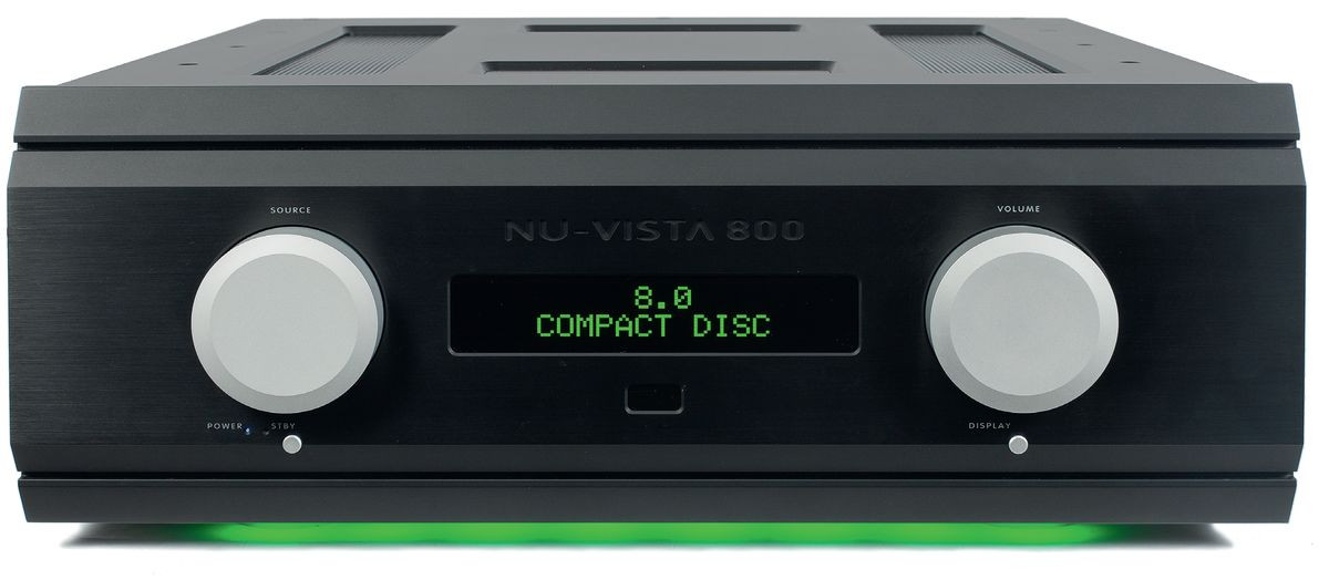 Można powiedzieć, że nie ma się czego czepiać, jeśli kogoś stać na Nu-Vistę, to bez wysiłku dokupi sobie odtwarzacz plików albo DAC. Problem jednak w tym, że wielu użytkowników chce mieć wszystko w jednym, bo to i wygodniejsze, i ładniejsze. Nie ma też wejścia gramofonowego, nie ma nawet wyjścia słuchawkowego... Trzeba będzie dokupić literalnie wszystko, chyba że właścicielowi wystarczy najprostszy system z odtwarzaczem CD i parą kolumn. Właściwie jedyne dodatkowe funkcje, jakie wzmacniacz (z przedniego panelu) udostępnia, to regulacja... oświetlenia. Zielone światło emituje nie tylko wyświetlacz, ale także "pasek" diod ciągnący się pod dolną, przednią krawędzią, i pierścienie wokół nuwistorów (na górze); producent przewidział osiem różnych kombinacji podświetlenia tych elementów.
