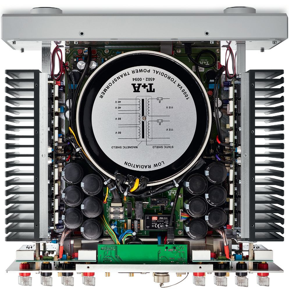 Napięcia zasilające bliskie 400 V są spotykane we wzmacniaczach lampowych, ale nie w tranzystorowych; T+A nie zamierza jednak imitować lampowego brzmienia... Producent przekonuje, że stosowanie wysokich napięć zasilających pozwala "wstrzelić" się w obszar najbardziej liniowej pracy tranzystorów. To z kolei procentuje stałym poziomem zniekształceń w szerokim zakresie mocy wyjściowej i niezależnie od częstotliwości. Nie chodzi tutaj o bezwzględny poziom zniekształceń (oczywiście najlepiej, aby i on był jak najniższy), ale o ich przebieg.