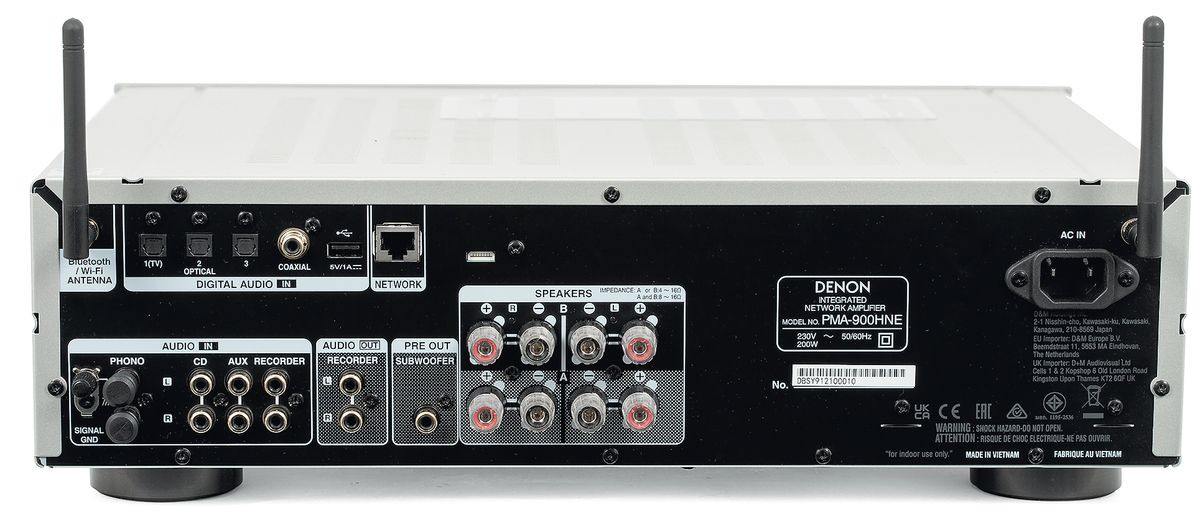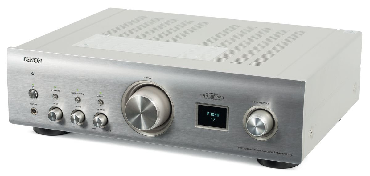 Denon PMA-900HNE to wzmacniacz nowoczesny, bogato wyposażony, a jednocześnie solidny. Sterowanie w całości powierzono rozwiązaniom mikroprocesorowym, a na wyświetlaczu są przedstawiane wszystkie funkcje; oczywiście poziom głośności i wybrane źródło, również zrównoważenie kanałów i korekcja barwy (możliwe do wyłączenia przez Source Direct).