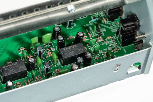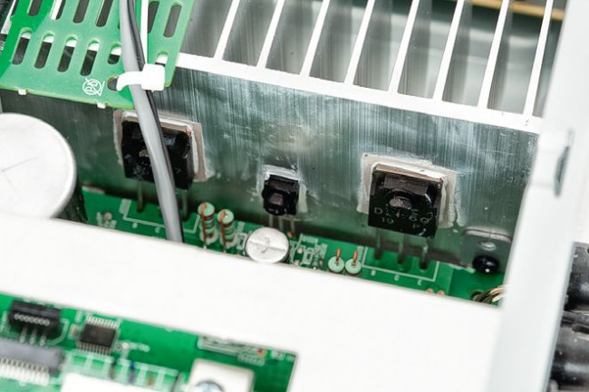 Denon nazywa stopnie wyjściowe AHC – to skrót od Advanced High Current. Na radiatorze zainstalowano dwie pary (po jednej na kanał) tranzystorów wyjściowych w formule Push-Pull. Przeniesienie regulacji w sferę mikroprocesorową stworzyło okazję do ustalenia krótkiej ścieżki sygnału. W centrum głównej płytki znajduje się scalony regulator wzmocnienia JRC NJU 72322.