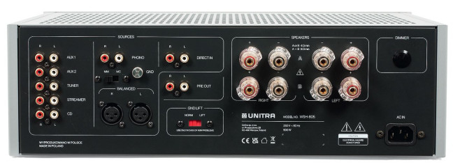 Na tylnej ściance Unitry WSH-805 dzieje się sporo, mimo że to wzmacniacz całkowicie analogowy. Są dwie pary zacisków głośnikowych, współczesnych, zakręcanych, z wejściem na bananki. Wejść liniowych jest aż sześć, (bez pętli dla rejestratora), w tym jedno XLR (chociaż układ nie jest zbalansowany) i wejście gramofonowe (z dwoma trybami pracy, MM oraz MC).