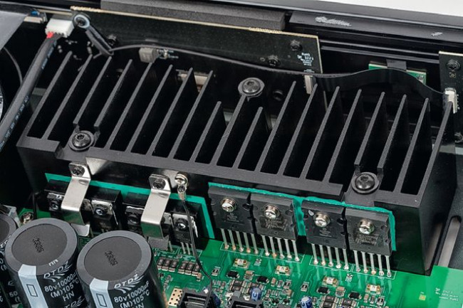 Do Arcama A25 trafiła już piąta generacja firmowych końcówek mocy w klasie G. W każdym kanale nadal pracuje jedna para tranzystorów wyjściowych, tuż obok niej widać rozbudowany zasilacz z niezależnymi obwodami dla dwóch głównych gałęzi – niskiego i wysokiego napięcia (to podstawa pracy układu w klasie G).