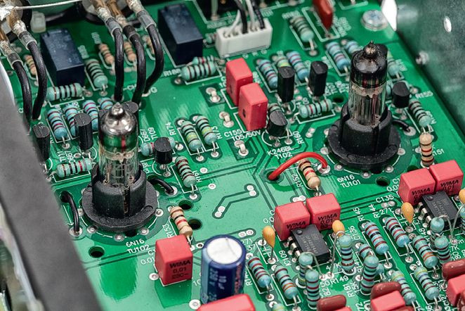 Ciepło lubi też przedwzmacniacz z dwoma stopniami wzmocnienia; w pierwszym mamy podwójną triodę 12AX7 (najpopularniejsza lampa do takich zastosowań); w drugim (tego nie widać już przez okienko na przednim panelu) dwie triody 6N1P.